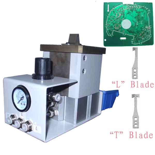 三,氣動鉤刀式PCB分板機(jī),CWV-LT(利于“T”或“L”型鉤刀刀片沖切來進(jìn)行分切,當(dāng)客戶需要分切異形PCB板的型號及數(shù)量不多時可選用此種方式,具有較高的經(jīng)濟(jì)性。)