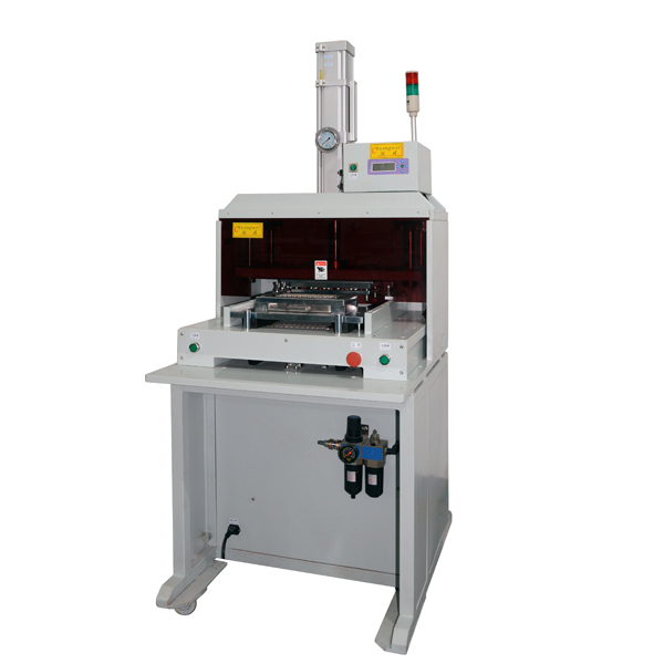 把分板沖模安裝在郵票孔pcb分板機(jī),氣動沖床式郵票孔pcb分板機(jī),CWPE,把要分切的PCB/FPC郵票孔板放于下模對應(yīng)位置,按啟動開關(guān)可進(jìn)行一次性分板,工作中下模采用自動推拉,減輕勞動強(qiáng)度,更提高安全度,同時取放成品十分方便。