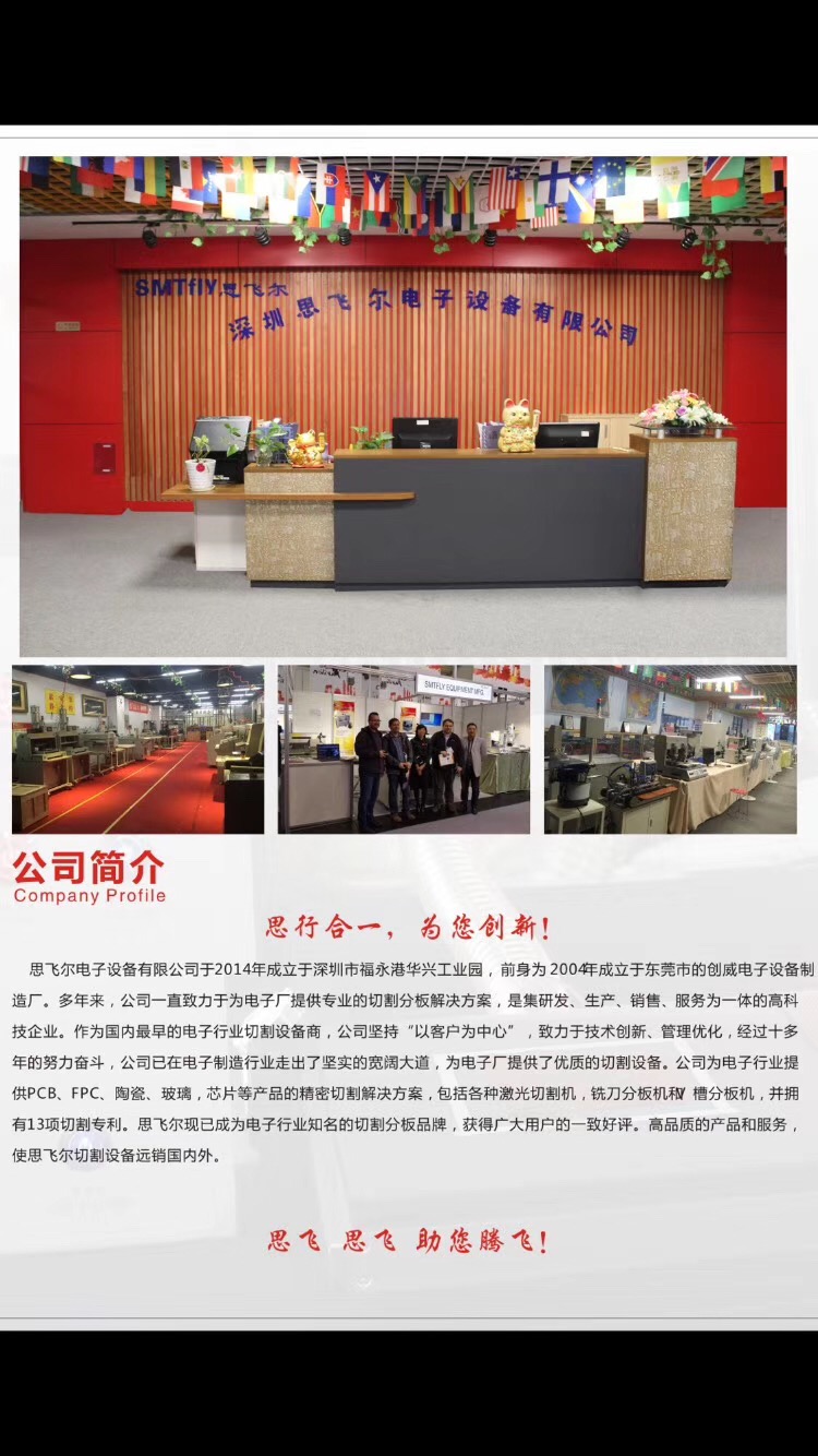 深圳思飛爾電子設(shè)備有限公司是一家專業(yè)致力于自動(dòng)化設(shè)備開發(fā)、生產(chǎn)、銷售于一體的公司,具有多年開發(fā)、生產(chǎn)經(jīng)驗(yàn)和雄厚的技術(shù)力量及生產(chǎn)能力。擁有長(zhǎng)期致力于自動(dòng)化控制及編程的技術(shù)人員和銷售團(tuán)隊(duì),開發(fā)有各種自主品牌自動(dòng)化設(shè)備項(xiàng)目。自主品牌設(shè)備有激光切割機(jī),FPC激光分板機(jī),PCB激光切割機(jī),陶瓷激光切割機(jī),等設(shè)備。功能齊全,性價(jià)比高,幫助電子廠又好又快制造產(chǎn)品歡迎垂詢、洽談。